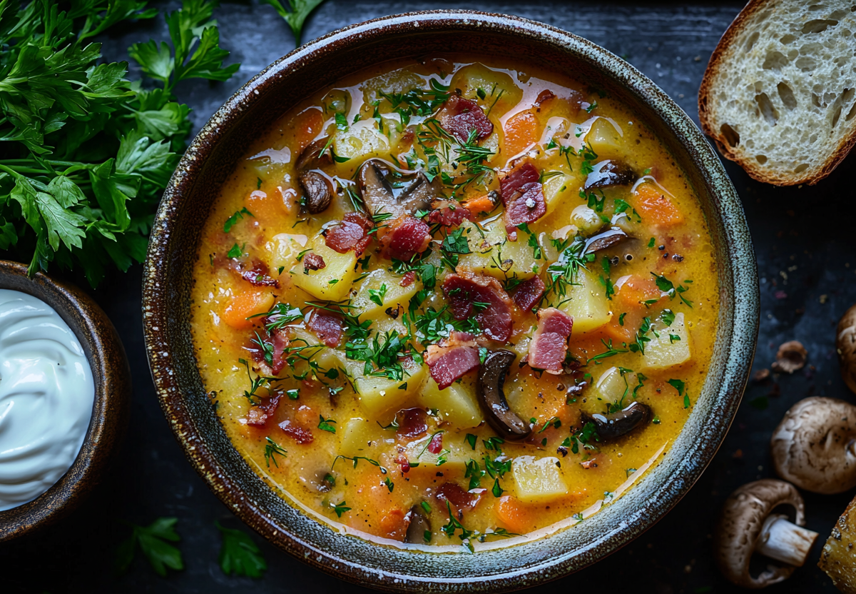 Брамборачка — чешский картофельный суп с грибами! Готовим обалденную вкуснятину на обед. Ароматный сытный суп с копченостями и лесными грибами — традиционное блюдо из Чехии.