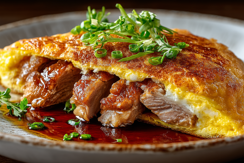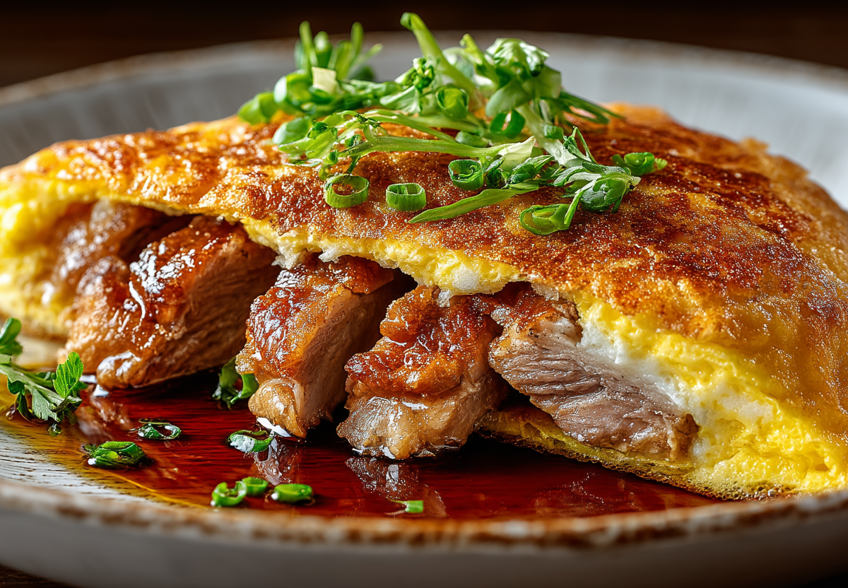 Жарю на огне чуть ниже среднего без крышки 2–3 минуты, пока яичный слой полностью не схватится. Затем аккуратно переворачиваю широкой лопаткой и готовлю еще 2 минуты до полной готовности мяса.