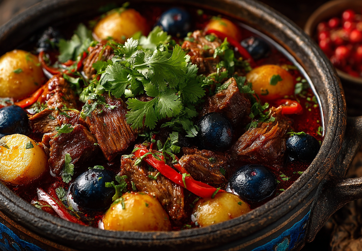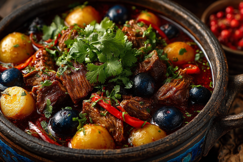 Буглама — это не просто рагу, а симфония вкусов. Внизу, на дне казана, лук начинает карамелизоваться в мясном соку. На нем — тяжелые куски мяса, которые отдают свой бульон. Выше — этажи из овощей: картофель, морковь, сладкий перец, помидоры. А сверху, как финальный аккорд, — зелень и терпкая зеленая слива. При томлении каждый слой отдает свой сок нижнему, создавая невероятно сложный и насыщенный соус.