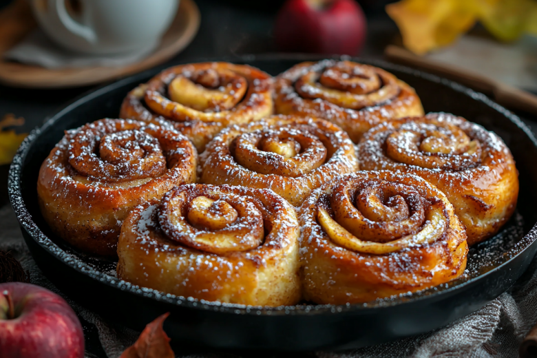 Для начинки я очищаю 2 яблока от кожуры и семечек, нарезаю мелкими кубиками. Обжариваю их на сковороде со столовой ложкой сливочного масла и чайной ложкой корицы до мягкости. Раскатываю тесто в прямоугольный пласт, равномерно распределяю яблочную начинку и сворачиваю в плотный рулет. Нарезаю его на порционные булочки толщиной 2–3 см. Обжариваю на сухой сковороде под крышкой по 3–4 минуты с каждой стороны до золотистого цвета. Подаю теплыми, посыпав сахарной пудрой.