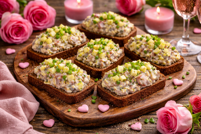Эта закуска удивляет с первого укуса. Нежная селёдка, пикантный чеснок, лёгкая острота табаско и свежесть яблока создают необычное, но очень гармоничное сочетание. Готовятся быстро, выглядят эффектно — идеальный вариант для романтического стола и весенних встреч. Вкус получается ярким, но сбалансированным: солоноватая рыба, хрустящий лук, мягкая яичная текстура и лёгкая сладость яблока сверху.