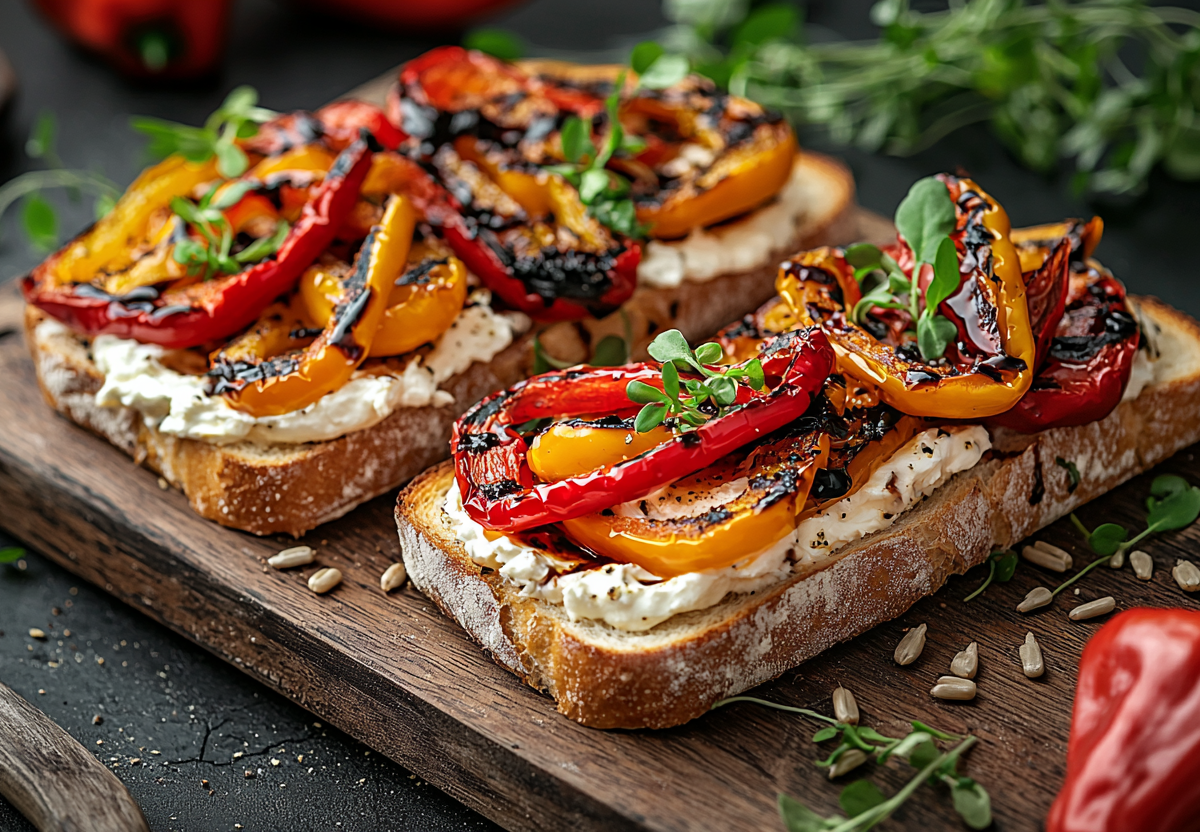 Бутерброды с запечённым перцем и творожным сыром! Эта закуска — настоящий взрыв вкусов! Нежная сливочная основа, сладковатые запечённые перцы с пряным чесночным акцентом и хрустящие тосты создают идеальную гармонию. А бальзамический крем и поджаренные семечки добавляют ноту ресторанного шика.