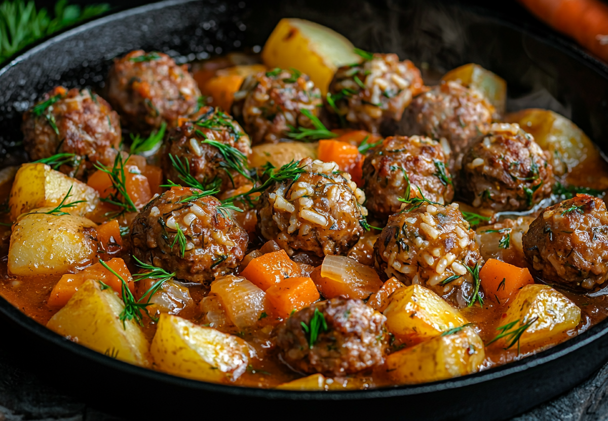 Быстро и на одной сковороде! Картошка с рисовыми ежиками в томатном соусе! Это сытное и ароматное блюдо сочетает нежные мясные фрикадельки с рисом, тушеные вместе с картофелем в пикантном соусе. Простое в приготовлении, но очень вкусное — идеальный вариант для семейного ужина!