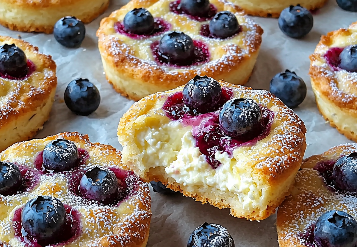 Смешайте творог, яйцо, муку, сахарную пудру и разрыхлитель. Сформируйте шарики на пергаменте или силиконовом коврике, придавите их стаканом и в каждом сделайте углубления с бортиками. Смешайте мягкий творог с голубикой и заполните им углубления. Выпекайте при 180 °C 15–20 минут.