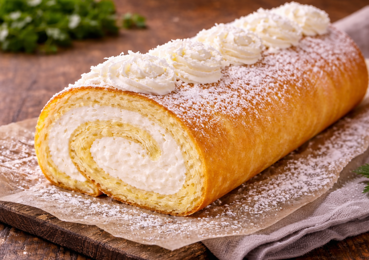 Быстрый рулет — этот десерт я готовлю, когда хочется чего-то эффектного, но без долгой возни. Один большой корж, нежный сливочный крем — все просто, быстро и всегда получается. Рулет выходит мягким, сочным и выглядит так, будто над ним трудились полдня.
