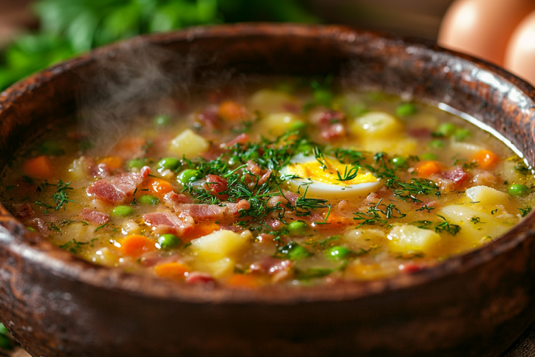 Ароматный суп с зелёным горошком, яйцом и беконом — это сытное и яркое блюдо, которое согреет в любой день. Нежная картофельная основа, сладость горошка и пикантность бекона создают гармоничный вкус, а зелень добавляет свежести. Идеальный обед для всей семьи!
