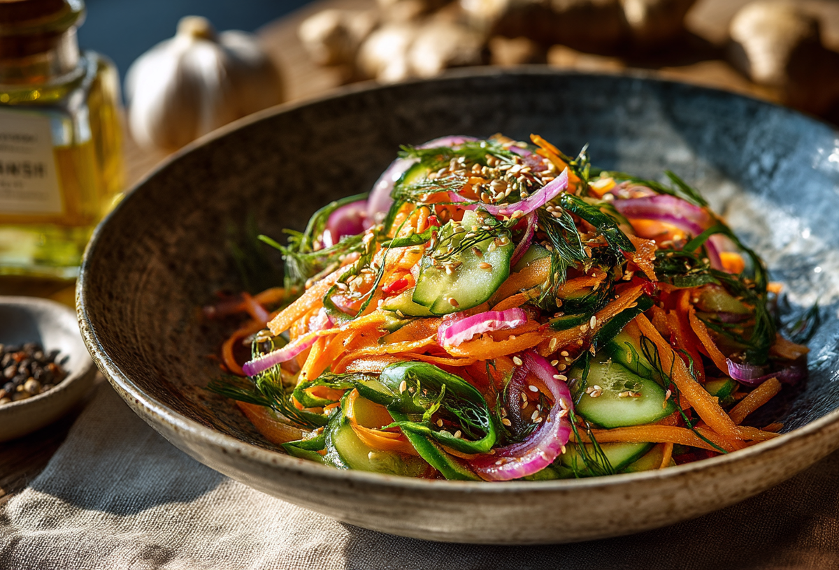 Иногда хочется приготовить что-то вкусное без дорогих продуктов и долгой нарезки слоев. Этот салат хорош тем, что собирается быстро, получается сочным и отлично подходит к любому гарниру. Главный секрет — ароматная горячая заправка, которая раскрывает вкус обычных овощей.