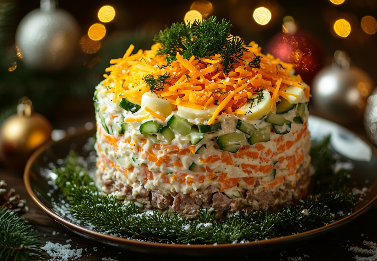 Ранее мы готовили салат «Новогодняя ночь» со шпротами. Слоеная закуска из самых простых продуктов, которая улетает первой.