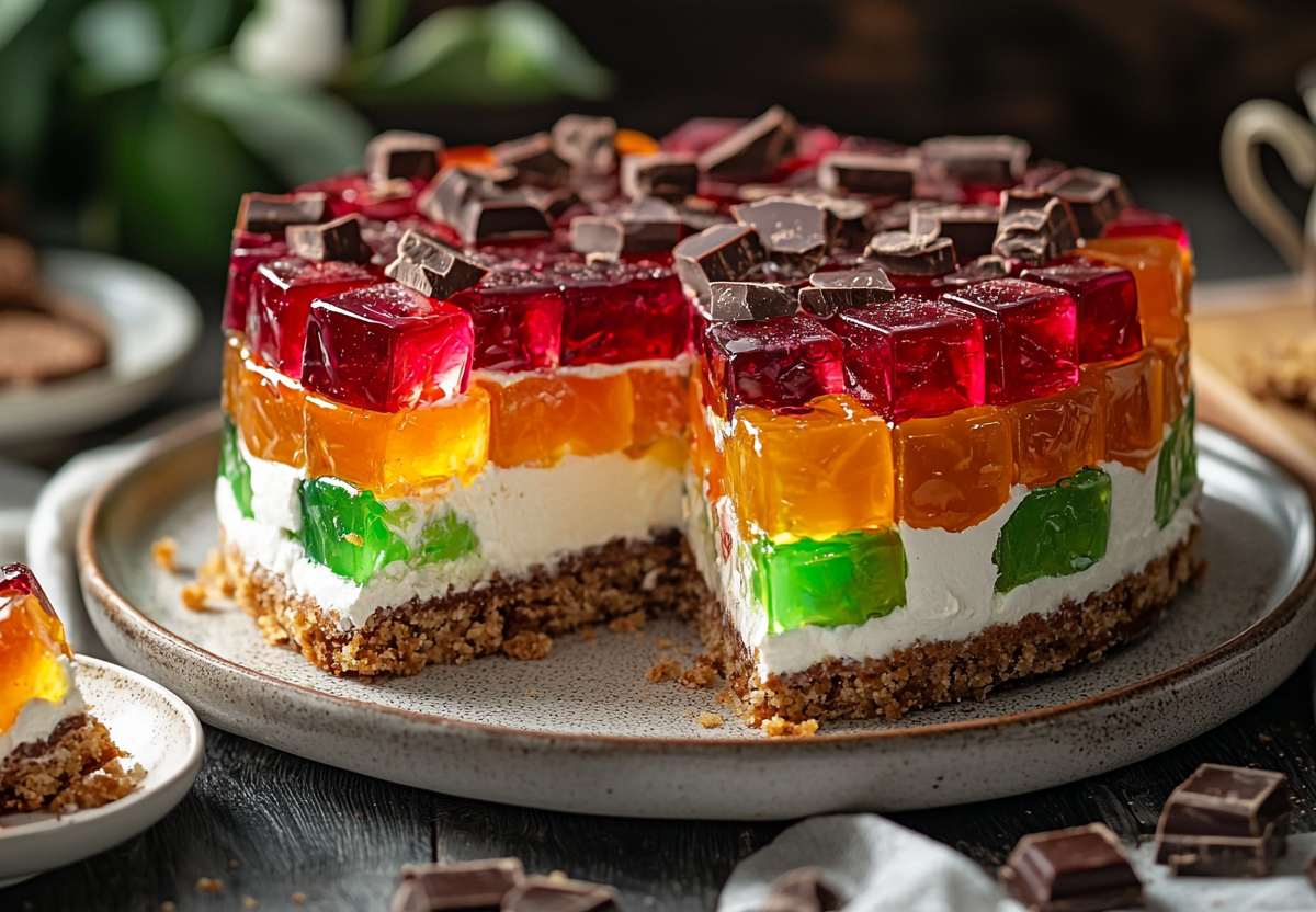 В трехлитровую емкость выложите кубики желе, печенье, ванилин и взбитую сметанную массу, аккуратно перемешайте. Накройте пленкой и поставьте в холодильник на 3–4 часа или на ночь. Перед подачей опустите форму на несколько секунд в горячую воду, переложите торт на тарелку, перевернув форму. Готовый десерт посыпьте тертым шоколадом.