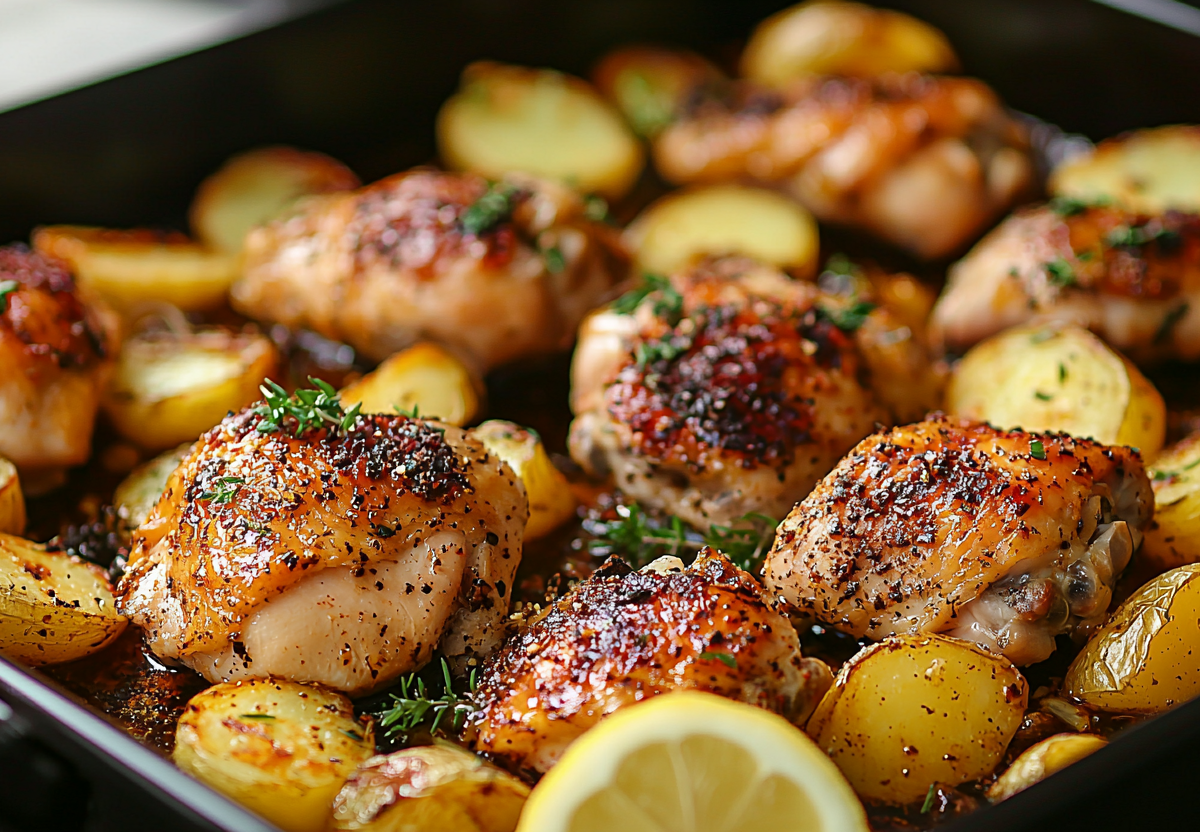 Картофель очистите и нарежьте крупными дольками. Куриные бедра промокните бумажным полотенцем и обильно натрите смесью соли, перца, паприки и орегано. В глубоком противне смешайте картофель и неочищенные зубчики чеснока, полейте 3 ст. л. оливкового масла, посолите. Сверху разложите куриные бедра кожицей вверх, сбрызните оставшимся маслом. Запекайте в разогретой до 200 °C духовке около 50–60 минут, пока картофель не станет мягким, а курица — золотистой. Подавайте горячим, полив соком из противня и украсив долькой лимона.