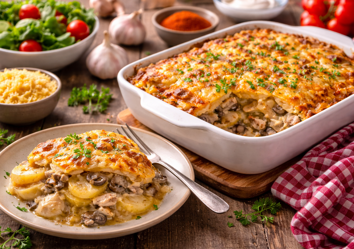 В итоге получается обалденная вкуснятина: румяная сырная корочка с лёгким копчёным ароматом паприки, под которой скрываются нежные слои картофеля, сочная курица, ароматные грибы и сливочно-сметанный соус с чесночной ноткой. Сытно, согревающе и очень по-домашнему.