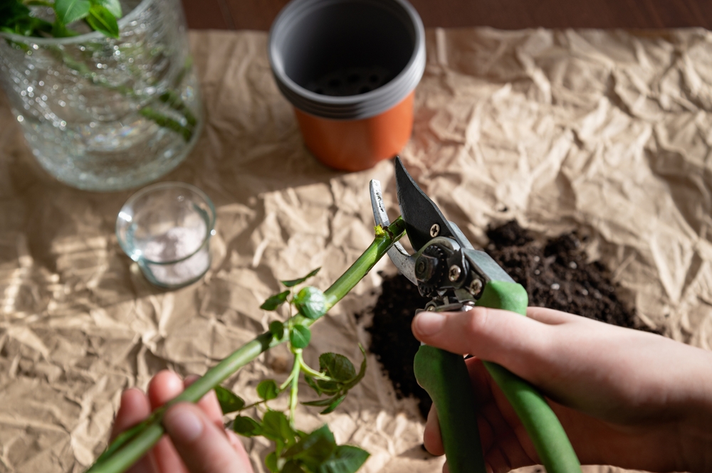 Выберите для черенка упругую ветку средней толщины и сделайте ровные срезы. Нижний срез должен быть косым, прямо под почкой, а верхний — прямым и на пару сантиметров выше почки. Оптимальная длина черенка — 15–20 см.