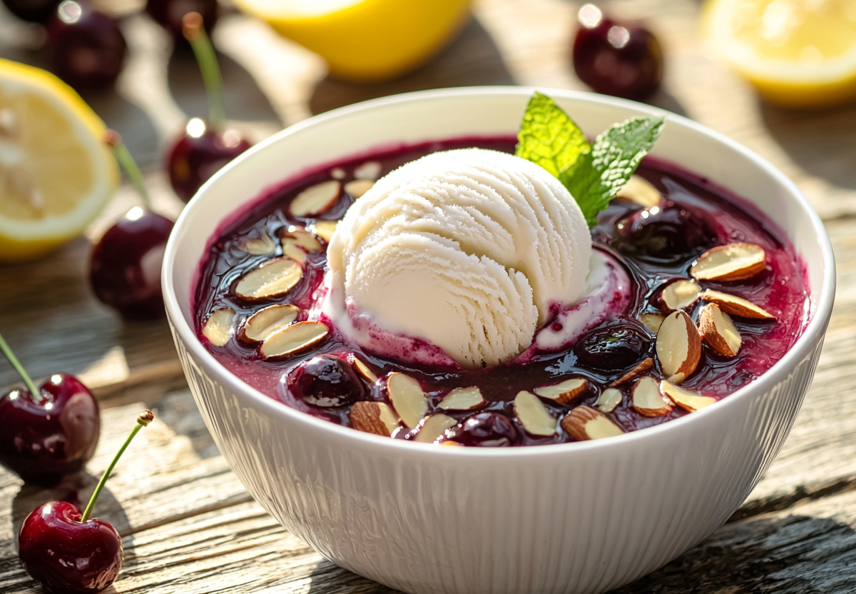 Для этого понадобится: черешня (1,5 кг), лимон, белое вино (0,5 л), сливки (100 мл), соль. Для украшения — мороженое, миндаль и мята.