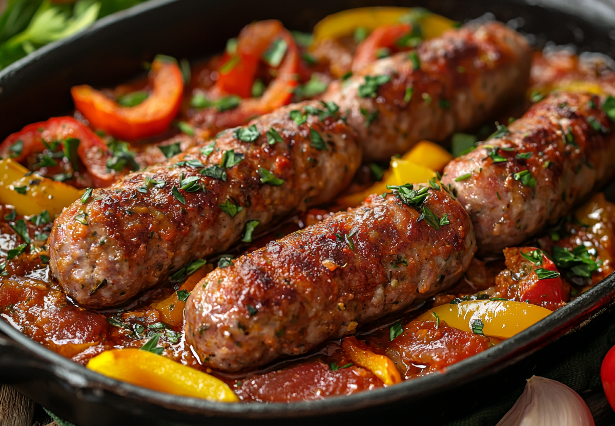 Вкус потрясающий: сочные, пряные колбаски и густой, сладковатый овощной соус создают идеальную гармонию. Подавайте с картофелем или лепешками.