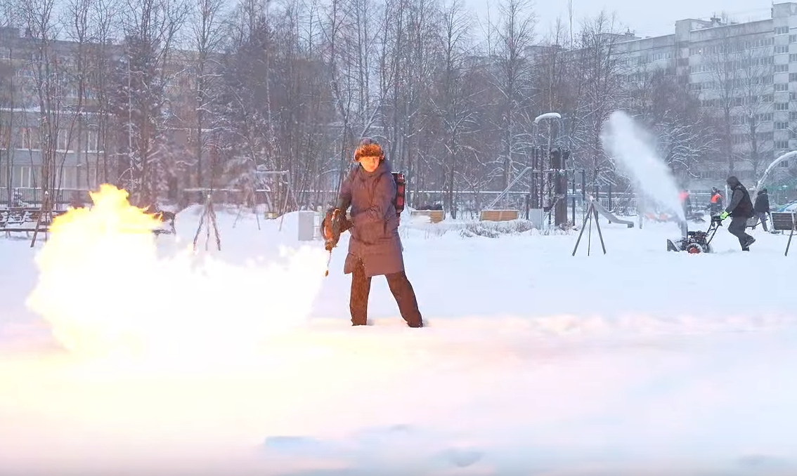 Глава муниципалитета Куликов вышел убирать снег огнеметом в Петербурге