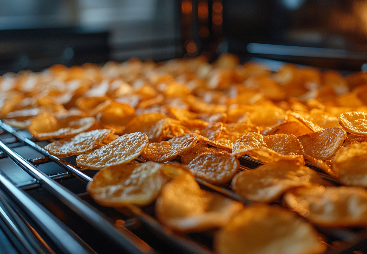 Отправьте в духовку, разогретую до 100–120°C, и сушите 1,5–2 часа. Примерно через час переверните чипсы на другую сторону.