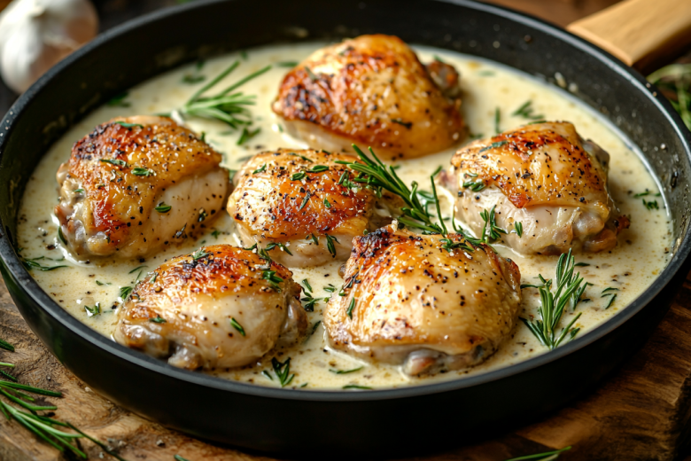 Курицу разделайте на крупные куски, посолите и обжарьте на сковороде до золотистой корочки. В ту же сковороду добавьте измельченный чеснок, обжарьте 30 секунд, затем влейте сливки с водой, положите приправы и доведите соус до кипения. Верните курицу в соус, тушите под крышкой 15–20 минут. Готовое блюдо подавайте, щедро полив соусом и посыпав свежей зеленью.