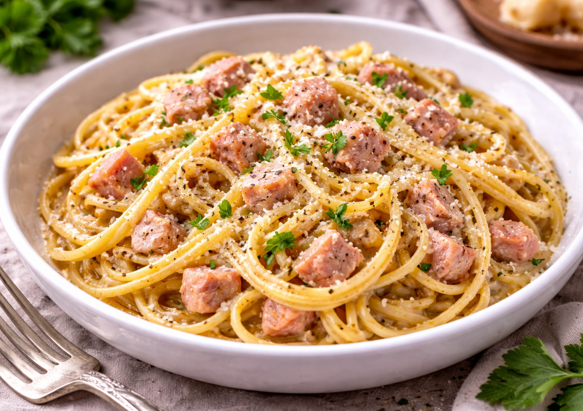 Как готовлю: спагетти отвариваю в подсоленной воде до состояния al dente, немного воды от варки обязательно сохраняю. Ветчину из индейки нарезаю и быстро обжариваю на антипригарной сковороде с каплей масла — буквально 2-3 минуты, до легкой румяности. В миске смешиваю желтки, сливки, большую часть тертого сыра, чеснок, соль и перец. Готовые макароны сразу перекладываю к ветчине, вливаю соус и активно перемешиваю. Убавляю огонь до минимума и прогреваю 2-3 минуты, пока соус не станет густым и шелковистым. При необходимости добавляю немного воды от пасты. Подаю сразу, посыпав оставшимся сыром и свежемолотым перцем.