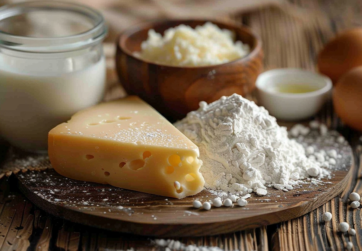 Возьмите стакан молока, 0,5 чайной ложки сахара, яйцо, 150–200 граммов твердого сыра, 0,5 чайной ложки разрыхлителя, стакан муки, растительное масло и соль по вкусу.