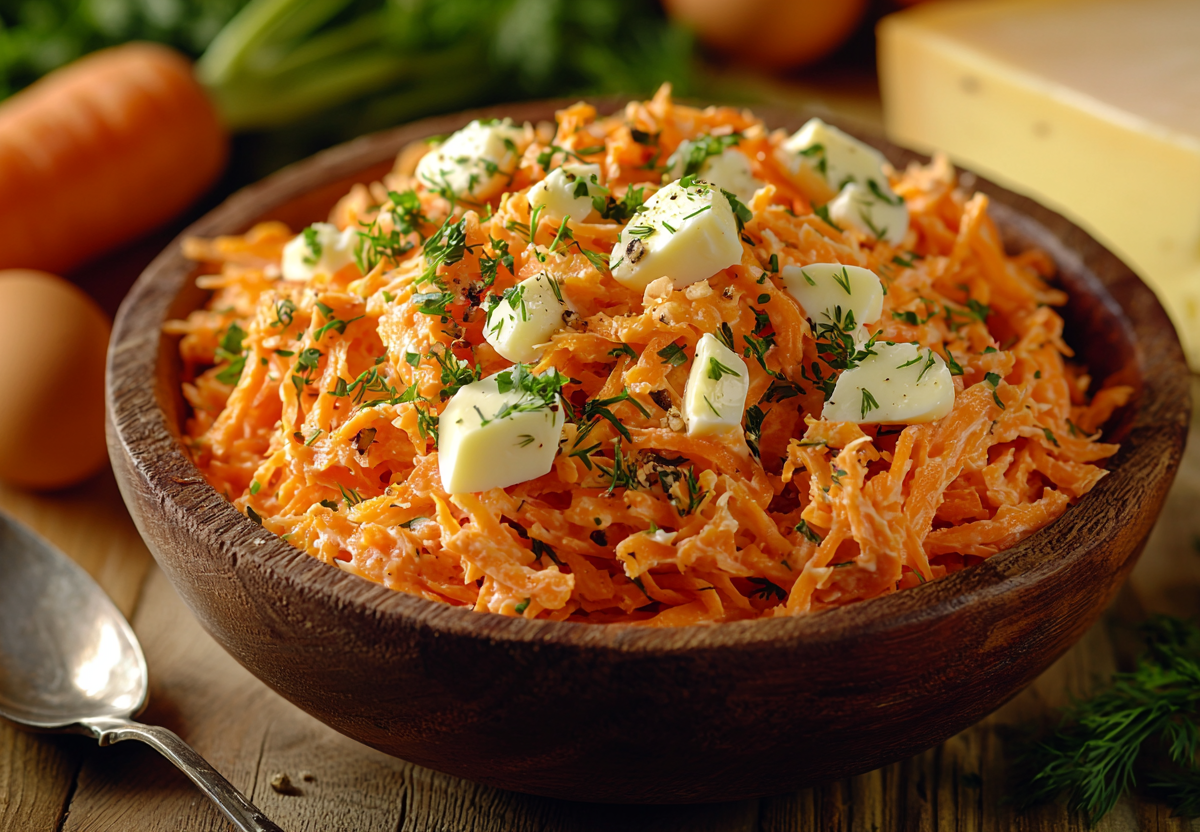 Чумовой салат из морковки и колбасного копченого сыра! Лёгкий, питательный и яркий — этот витаминный салат станет отличным дополнением к обеду или полезным перекусом. Сочетание моркови, яиц и сыра даёт баланс белка и клетчатки, а чесночно-сметанная заправка добавляет пикантности.