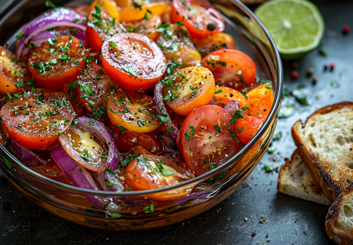 Чумовой салат из помидоров и красного лука! Невероятная заправка с аджикой и соевым соусом! Это яркое, свежее и необычное блюдо, которое отлично подходит для лёгкого обеда или ужина. Основу составляют спелые помидоры, которые сочетаются с ароматной заправкой на основе аджики, сока лайма и соевого соуса.