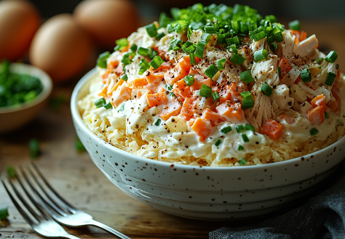 Чумовой салат «Самый смак» с копченым сыром-косичкой! Просто, но мегавкусно! Этот салат действительно оправдывает свое название — он самый сытный, самый ароматный и самый простой в приготовлении! Нежная курица, сочная морковь, яйца и пикантный копченый сыр создают идеальный баланс вкусов. А зеленый лук добавляет свежую нотку.