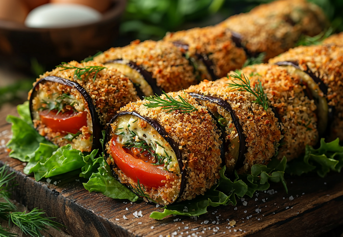 1. Подготовьте баклажаны. Нарежьте вдоль тонкими пластинами (5–7 мм), посолите и поперчите. Обмакните во взбитое яйцо, затем в сухари. Обжарьте на среднем огне до золотистой корочки (по 2–3 минуты с каждой стороны)
