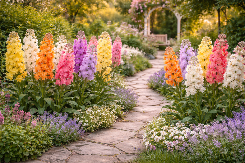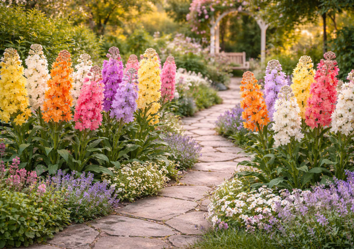 Если выбирать цветок не только «для картинки», но и для атмосферы сада, высокорослый левкой (маттиола седая) — один из самых выразительных вариантов. Это однолетник, который за один сезон формирует мощные прямые стебли высотой 60–80 см и крупные плотные махровые соцветия, напоминающие ароматные свечи.
