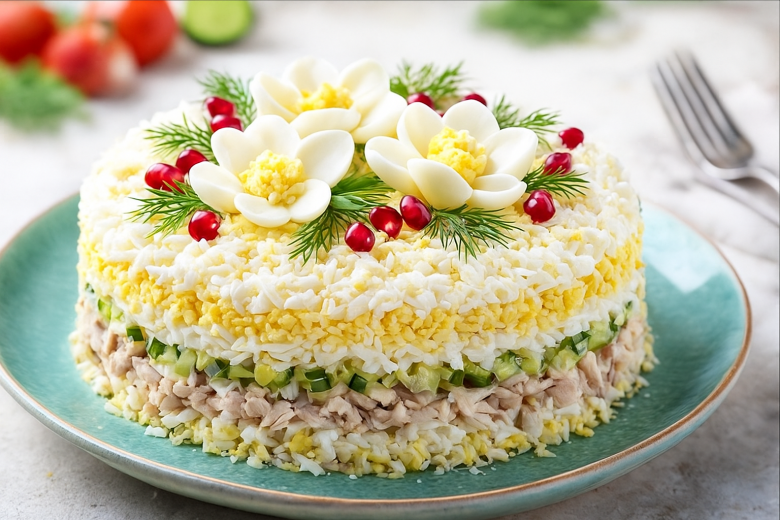 Новогодний стол — это всегда ожидание чуда и красоты, и салат «Цветочная поляна» создан именно для этого. Он сочетает в себе нежнейшие слои: рассыпчатый рис, соленую красную рыбу, хрустящий огурец и маринованный лук, которые вместе создают идеальный баланс вкусов. Но главное — это его праздничный вид. Украшенный яркими «цветами» из яиц и изумрудным укропом, этот салат превращает обычную тарелку в настоящую весеннюю поляну посреди зимы, даря ощущение свежести, радости и волшебства.