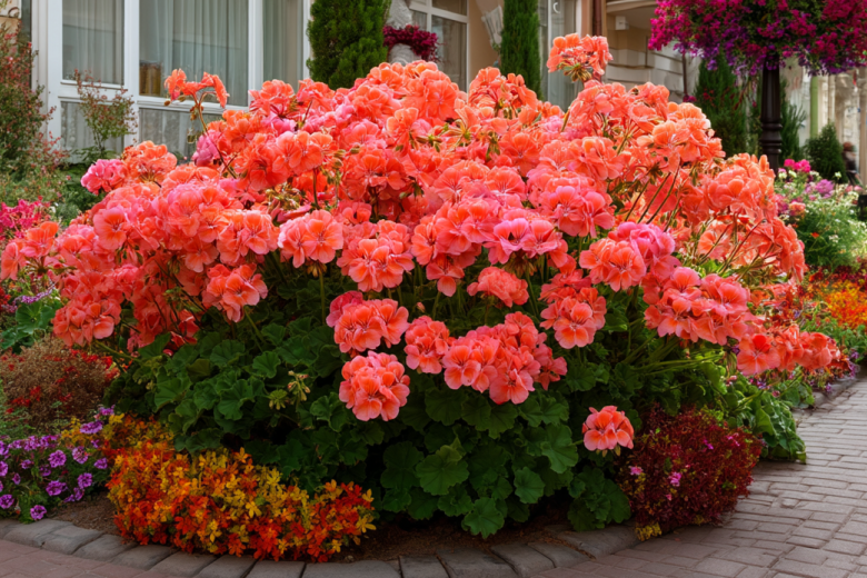 Ее главное достоинство — продолжительное и пышное цветение: шапки ярких зонтиков (красных, розовых, белых, сиреневых и даже персиковых) украшают кусты с мая по сентябрь. В отличие от роз, которым нужен постоянный уход, пеларгония неприхотлива: она засухоустойчива, не боится жары и отлично чувствует себя на бедных почвах.