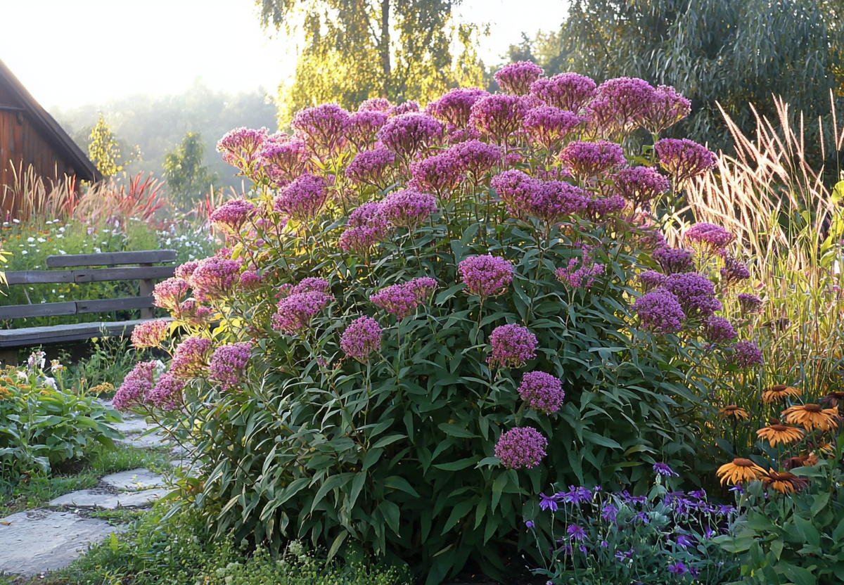 Речь о посконнике — мощном и выносливом многолетнике, который стабильно цветет с середины лета до глубокой осени, невзирая на капризы погоды. Его крупные, пушистые соцветия-шапки лиловых или розовых оттенков величественно возвышаются над клумбой, привлекая бабочек. Главный секрет посконника — феноменальная жизнестойкость. Он прекрасно зимует без укрытия, не боится переувлажнения (что актуально в дождливые сезоны) и практически не поражается вредителями.