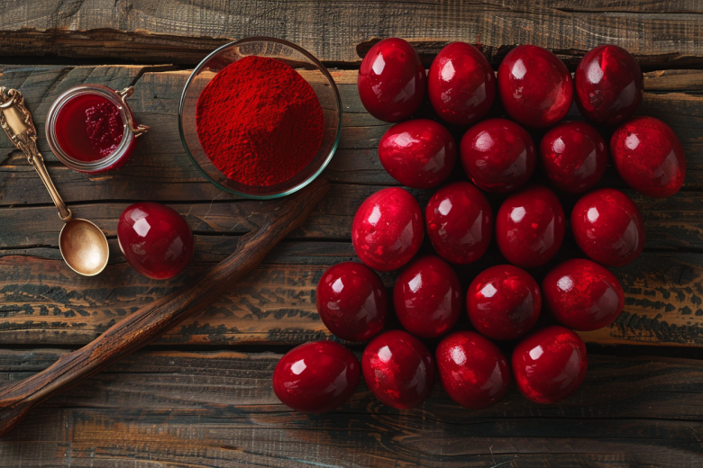 Кармин — натуральный краситель, который дает насыщенный красный цвет. Его легко найти, а расход минимальный. Сначала растворите порошок в воде, добавьте кислоту или уксус — это усилит яркость. Затем аккуратно опустите сырые белые яйца и варите около 10–15 минут после закипания.