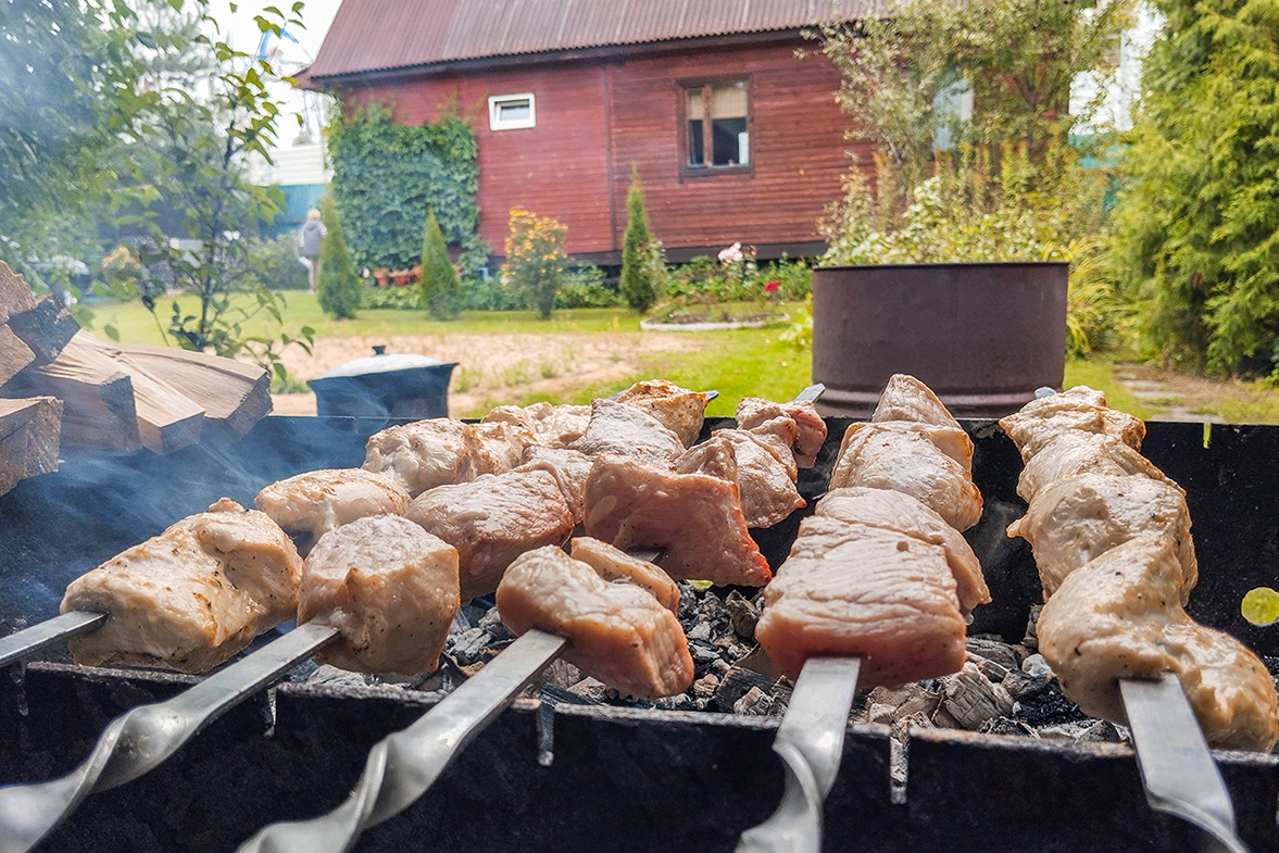 Он напомнил, что жарить шашлыки можно только в металлическом или кирпичном мангале, жаровне или печи. Расстояние до построек должно быть не менее пяти метров, а вокруг мангала — очищенная зона радиусом два метра. Рядом обязательно должны быть вода или огнетушитель.