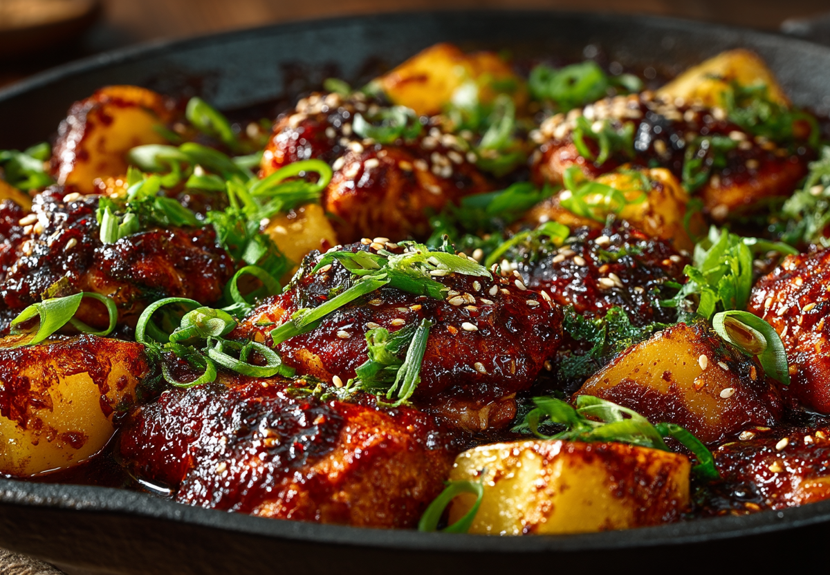 Разогреваем духовку до 220 °C. В кувшине или миске взбиваем в однородный соус 4 ст. л. пасты кочуджан, 2 ст. л. темного соевого соуса, 3 ст. л. рисового вина, 1 ст. л. кунжутного масла, 1 ч. л. сахарной пудры и кусочек тертого свежего имбиря (4--5 см). 1 кг куриных бедрышек (с кожей и костью) складываем в миску, добавляем к ним 3 ст. л. приготовленного соуса и хорошо обваливаем. В оставшийся в кувшине соус вливаем 250 мл горячего куриного бульона и снова взбиваем. В большую форму для запекания (примерно 30×40 см) выкладываем 2 крупно нарезанные луковицы, 8 очищенных зубчиков чеснока, 650 г молодого картофеля (разрезанного пополам или на три части) и куриные бедрышки. Все заливаем соусом с бульоном. Накрываем форму плотно фольгой и отправляем в духовку на 30 минут. Затем снимаем фольгу, убавляем температуру до 200 °C и запекаем еще 30--40 минут без крышки, пока курица не зарумянится, а картофель не станет мягким внутри и хрустящим снаружи. Готовое блюдо посыпаем 4 мелко нарезанными перьями зеленого лука и 2 ч. л. обжаренного кунжута. Подаем сразу, поливая соусом со дна формы.