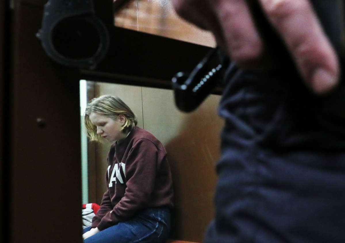 Трепова на скамье подсудимых смотрит в пол. Ранее суд по ее делу был объявлен закрытым по ходатайству следствия, хотя защитники настаивали, что секретные сведения, о которых говорит обвинение, давно были распространены СМИ.