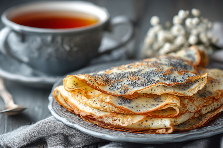 Начните приготовление с подготовки мака: залейте его кипятком на 15–20 минут, затем слейте воду и обсушите. В глубокой миске взбейте яйца с сахаром и солью. Добавьте половину молока и всю муку. Взбейте до получения гладкого теста. Затем влейте оставшееся молоко и растительное масло. Снова взбейте. Добавьте в тесто подготовленный мак и перемешайте. Дайте тесту постоять 10–15 минут. Разогрейте сковороду. Перед первым блинчиком можно слегка смазать ее каплей масла, дальше в этом не будет необходимости. Наливайте тесто половником, быстро распределяя его по сковороде тонким слоем. Жарьте с каждой стороны по 1-2 минуты до золотистых краев. Подавайте горячими со сметаной, медом, вареньем или просто свернутыми трубочкой.