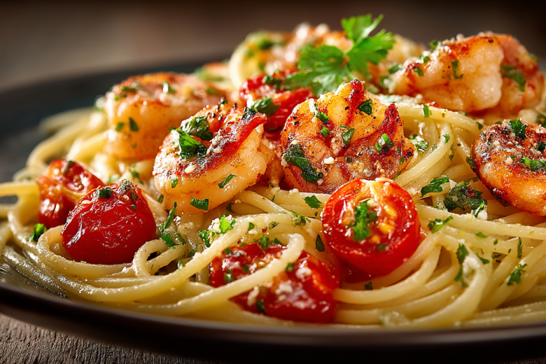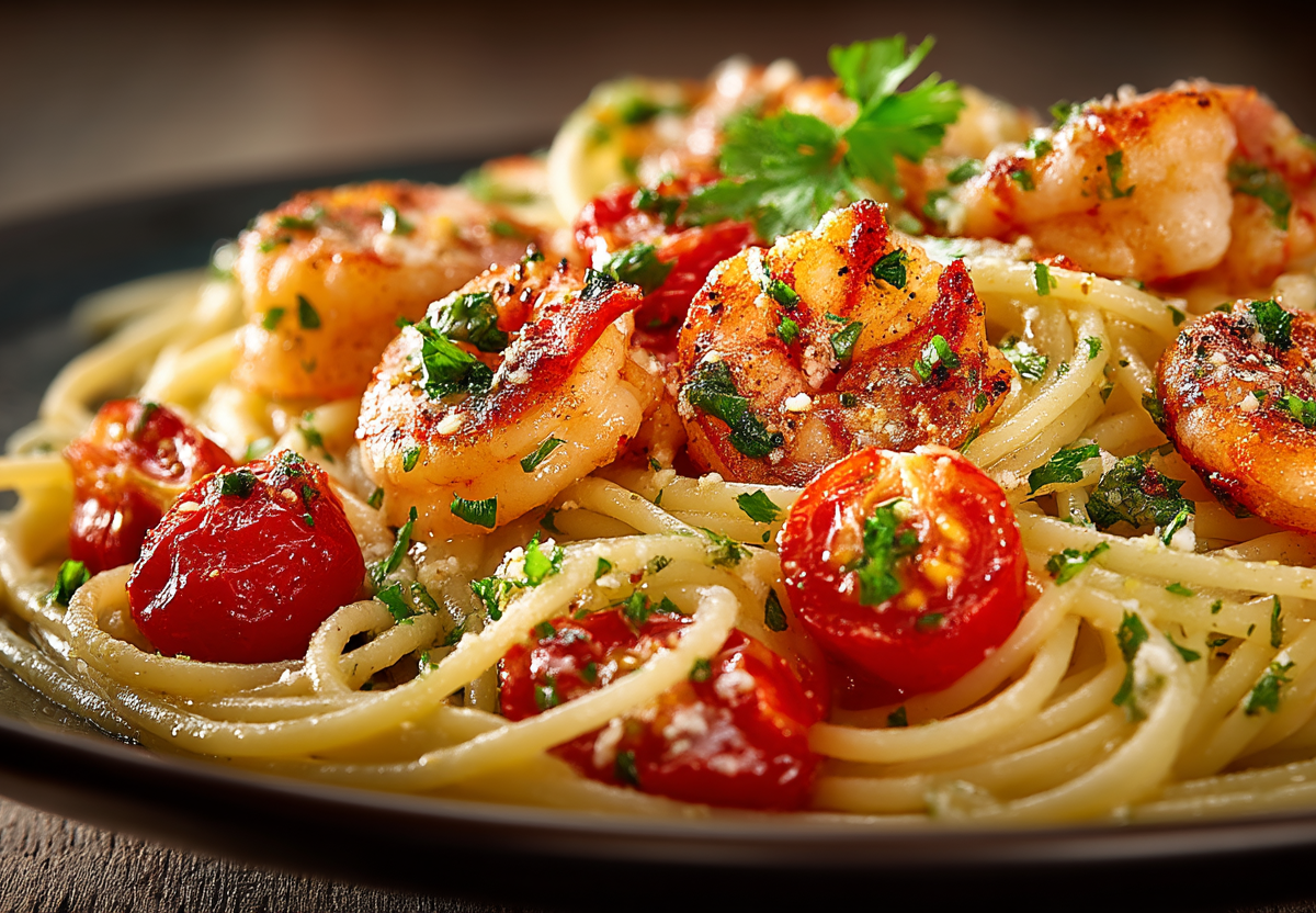 Когда время на исходе, а душа просит чего-то по-настоящему вкусного и изысканного, этот рецепт становится настоящим спасением. Ароматные креветки, взрывные помидоры черри и паста создают гармоничный ансамбль, который впечатлит даже искушенного гурмана.