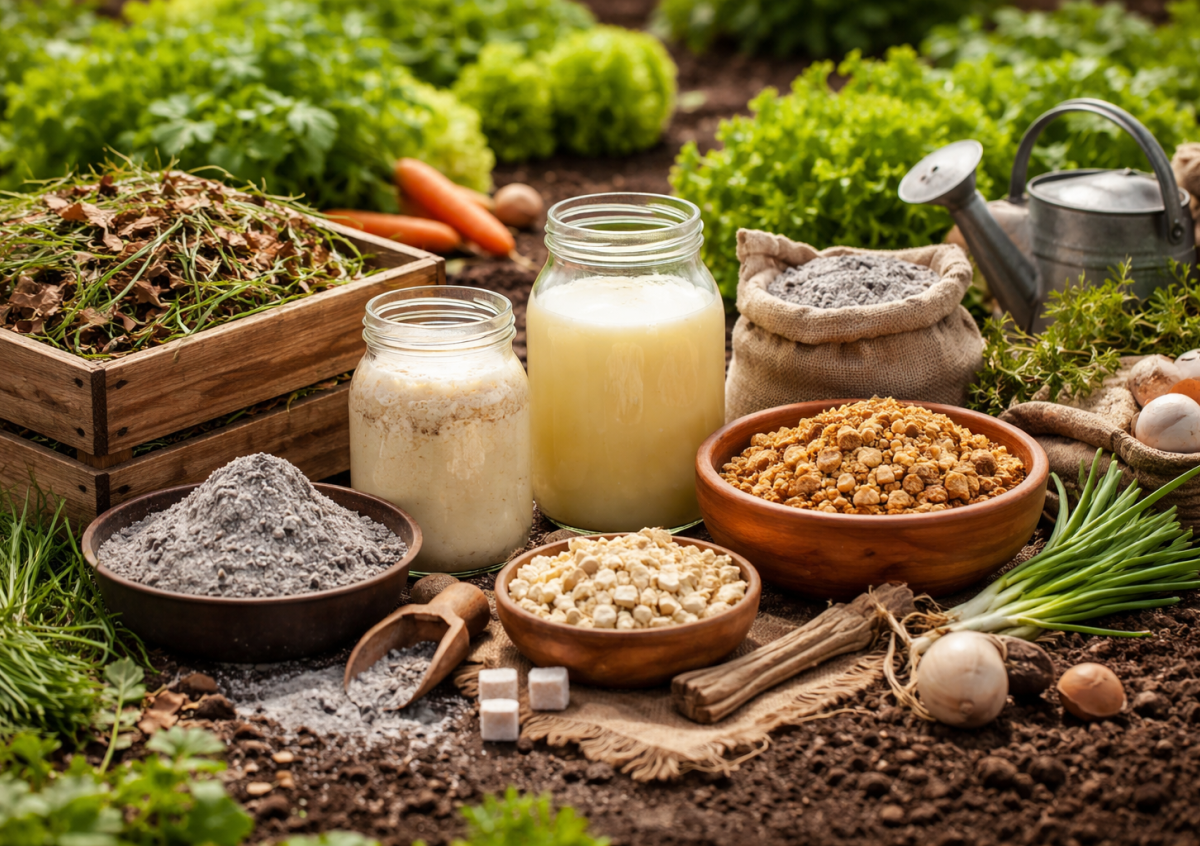 Самый простой способ — использовать натуральные растворы. Например, разведите 1 литр сыворотки в 9 литрах воды и пролейте грядки — это помогает активизировать микрофлору. Хорошо работает и дрожжевая подкормка: 10 г сухих дрожжей и 1 ст. ложку сахара растворите в теплой воде, дайте настояться и затем разведите в ведре воды.