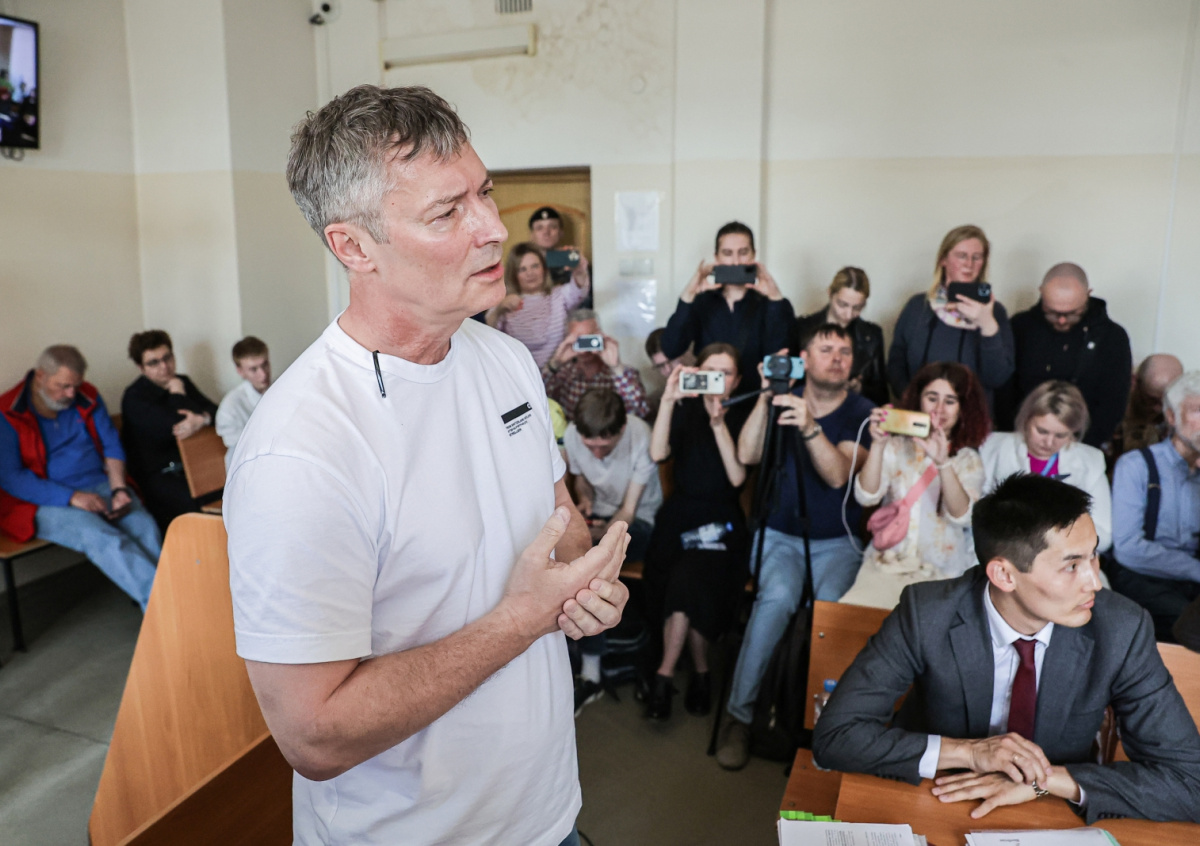 Бывший мэр Екатеринбурга Евгений Ройзман (признан в РФ иноагентом) во время перерыва у здания Октябрьского районного суда