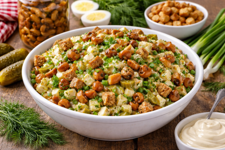 Когда гости уже на пороге, а в холодильнике минимум продуктов — этот салат спасает за считанные минуты. Нежные маринованные опята, яйца, хрустящие сухарики и солёный огурчик создают яркий, насыщенный вкус, от которого сложно оторваться. Просто, бюджетно и очень аппетитно — именно такие рецепты хочется сохранять.