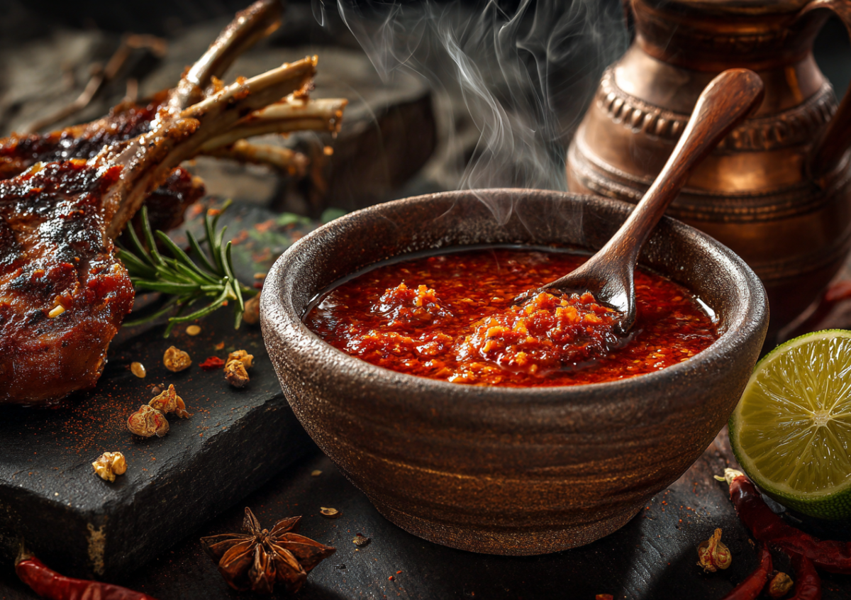 Возьмите 1 кг мясистых томатов, 400 г алого сладкого перца, 250 г острого перца чили, головку чеснока (150 г), 3 ст. л. крепко заваренного чая «улун» (остудить), 70 г очищенных конопляных семечек (легко обжарить на сухой сковороде до аромата), 1 ст. л. гималайской розовой соли (крупный помол), 1 ч. л. смеси «Мегрели Хмели» (или обычной хмели-сунели + щепотка уцхо-сунели), горсть свежего эстрагона и пучок кинзы. Финальный штрих — сок половинки лайма.