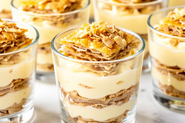 Готовлю быстрый наполеон в порционных стаканчиках на 8 Марта — беру готовые слоеные коржи и нежный заварной крем, а через 15 минут на столе изысканный десерт, достойный самых красивых дам. Это гениально простое и невероятно вкусное лакомство, идеальное для праздничного стола или уютного чаепития. Его необычность в том, что никакой возни с выпечкой и раскаткой — просто крошу готовые коржи, смешиваю с кремом и выкладываю в прозрачные стаканчики, где слои выглядят особенно эффектно. Получается обалденная вкуснятина: нежные, пропитанные кремом слои хрустящего теста, которые буквально тают во рту, оставляя сливочное послевкусие. Десерт смотрится нарядно и празднично, а каждая гостья сможет насладиться своей порцией, не нарушая идеальную композицию.