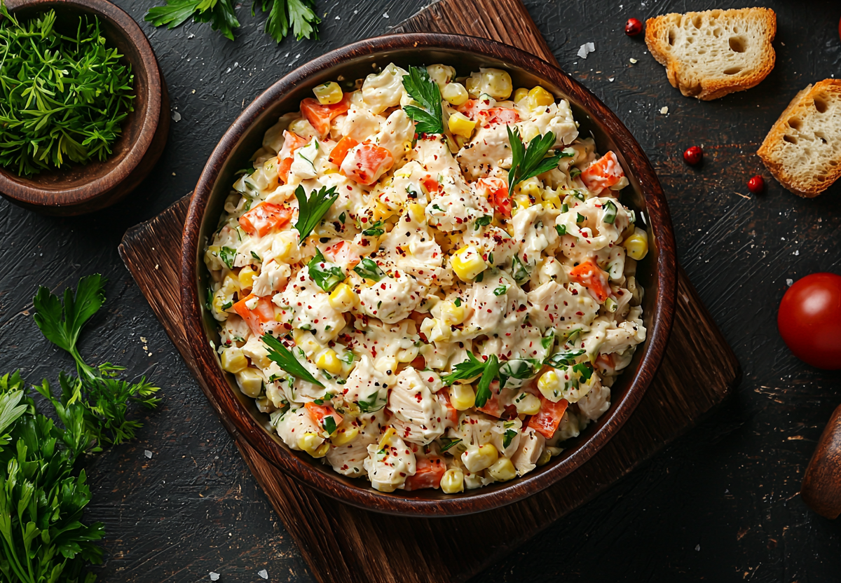 Вкус — идеальный баланс: нежное куриное карпаччо с пряной морковью, хрустящие сухарики и пикантная йогуртовая заправка. С этим салатом вы сможете наслаждаться праздником без угрызений совести!