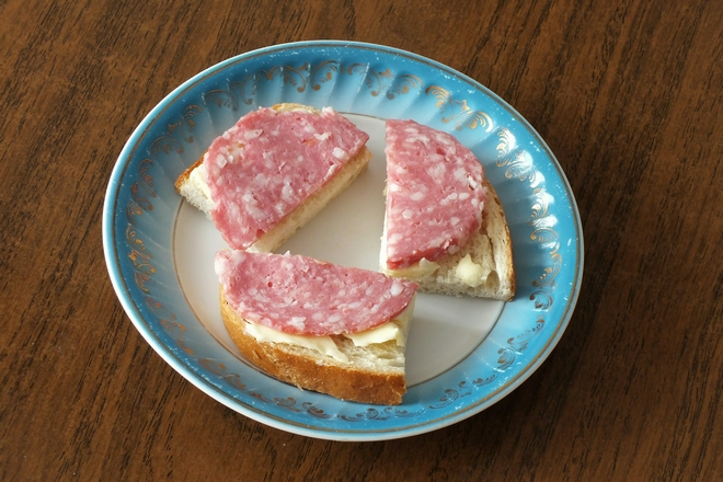 Можно отрезать пару кусочков тоненькой вкусной и пусть даже очень жирной колбасы, то такую порцию съесть можно.