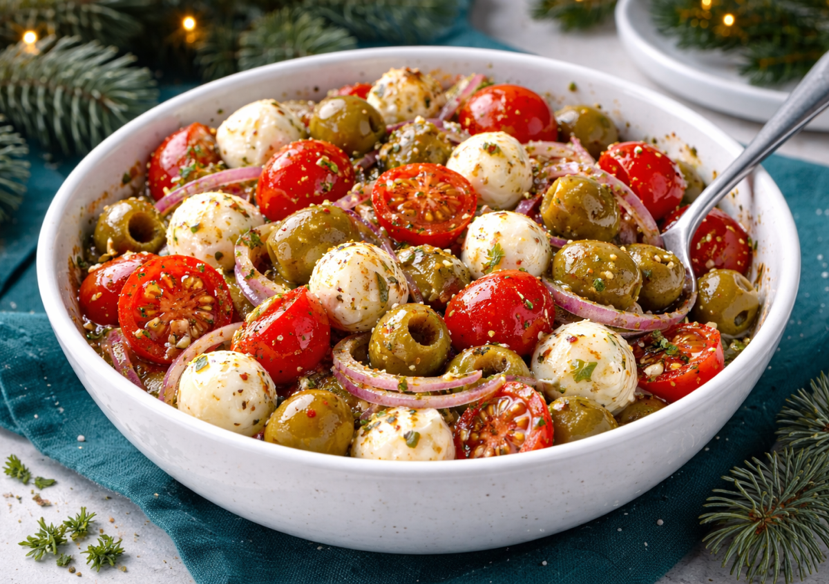Эта закуска выглядит просто, но вкус у нее такой, что к мясу потом просят именно ее, а не гарнир. Сочные томаты черри, нежные шарики моцареллы, ароматные оливки и пикантный маринад с медом, лимоном и чесноком превращаются в идеальное сопровождение к шашлыку, запеченному мясу или курице. Готовится элементарно, а результат — ресторанный.