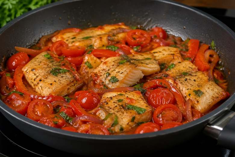 Получается очень гармонично: нежная рыба с румяной корочкой, сочные томаты, сладкий перец и легкая пикантность чеснока. Соус пропитывает кусочки, делая их мягкими и насыщенными по вкусу.
