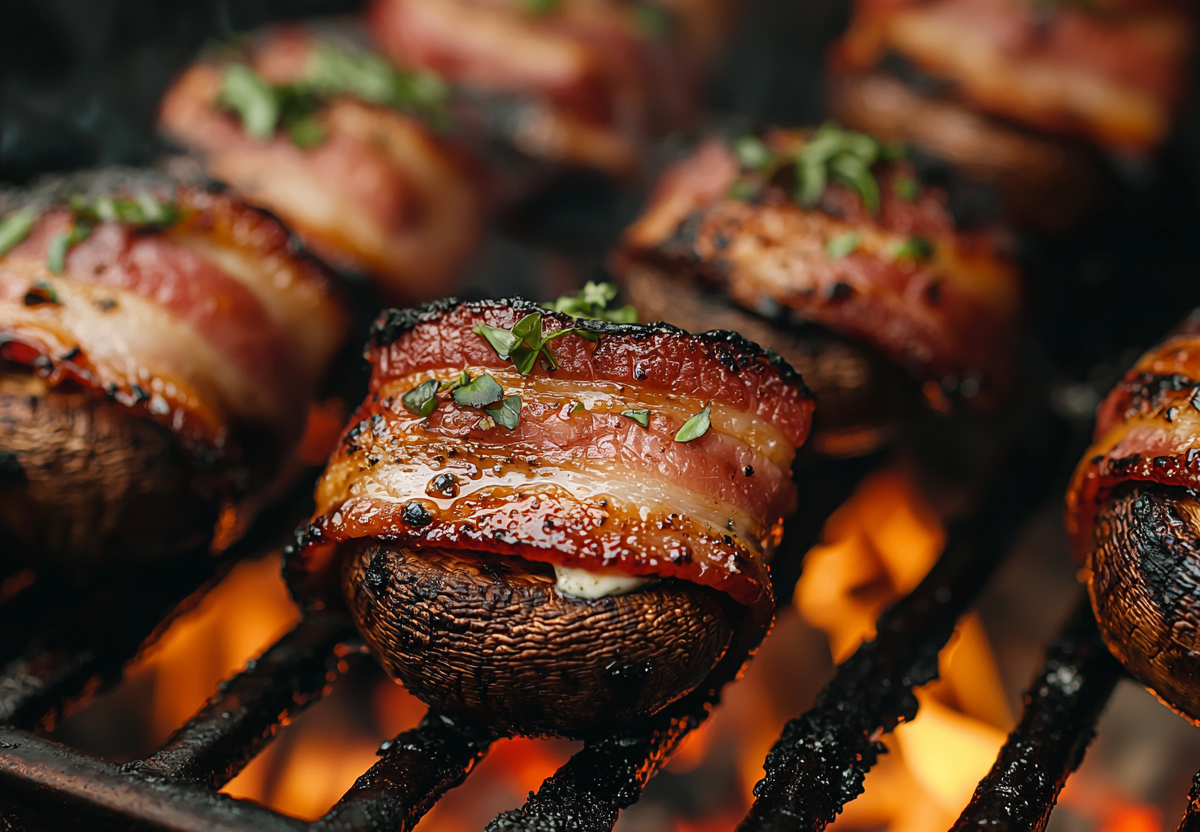 - Каждую шляпку плотно оберните полоской бекона. Обжарьте на решетке на мангале или на хорошо разогретой сковороде 3–4 минуты с каждой стороны до румяности.