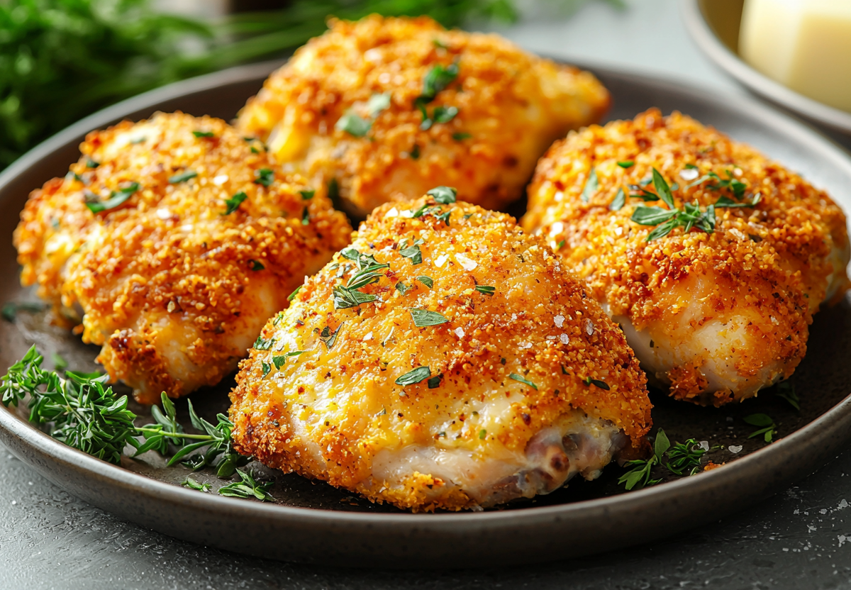 Лучше всего использовать куриные бедрышки на кости — они сохраняют сочность лучше всего. Кожа необязательна, но с ней корочка получается особенно хрустящей. Панировка из сыра, сухарей и паприки придаёт блюду яркий вкус и приятную текстуру.