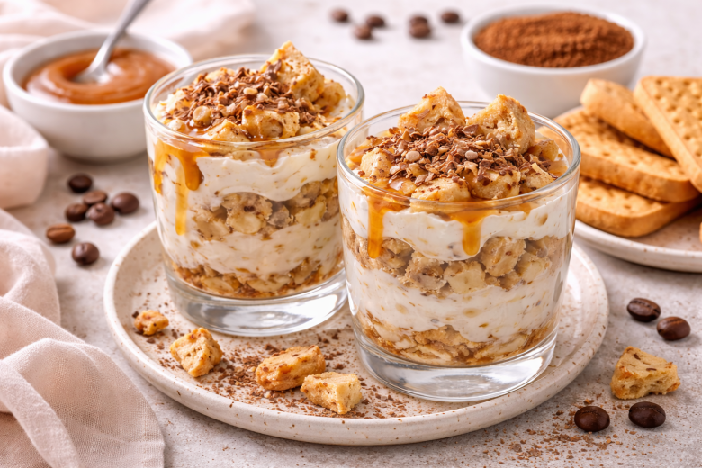 Банан нарезают мелким кубиком и сразу вмешивают в йогурт, добавляют кофе и хорошо перемешивают до однородности. Массу раскладывают по стаканам или пиалам. Печенье ломают на 2–3 части и вставляют в йогуртовый слой так, чтобы крем пропитал каждый кусочек. Сверху поливают карамелью, при желании посыпают тёртым шоколадом. Убирают в холодильник для пропитки. Для более плотной текстуры можно добавить 1–2 ст. л. мягкого творога — десерт станет гуще и ещё больше будет напоминать настоящий чизкейк. Нежно, ароматно и идеально к чашке кофе.
