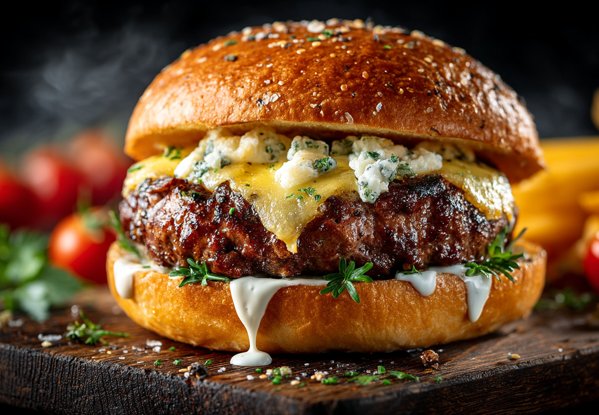 Этот бургер — для настоящих фанатов чеснока. Он есть везде: в котлете — сушеный, в начинке — свежий, в соусе — и свежий, и сушеный. Но он не перебивает, а дополняет, делает вкус насыщенным и глубоким. А сливки смягчают остроту, придавая чесноку благородный, бархатистый акцент.